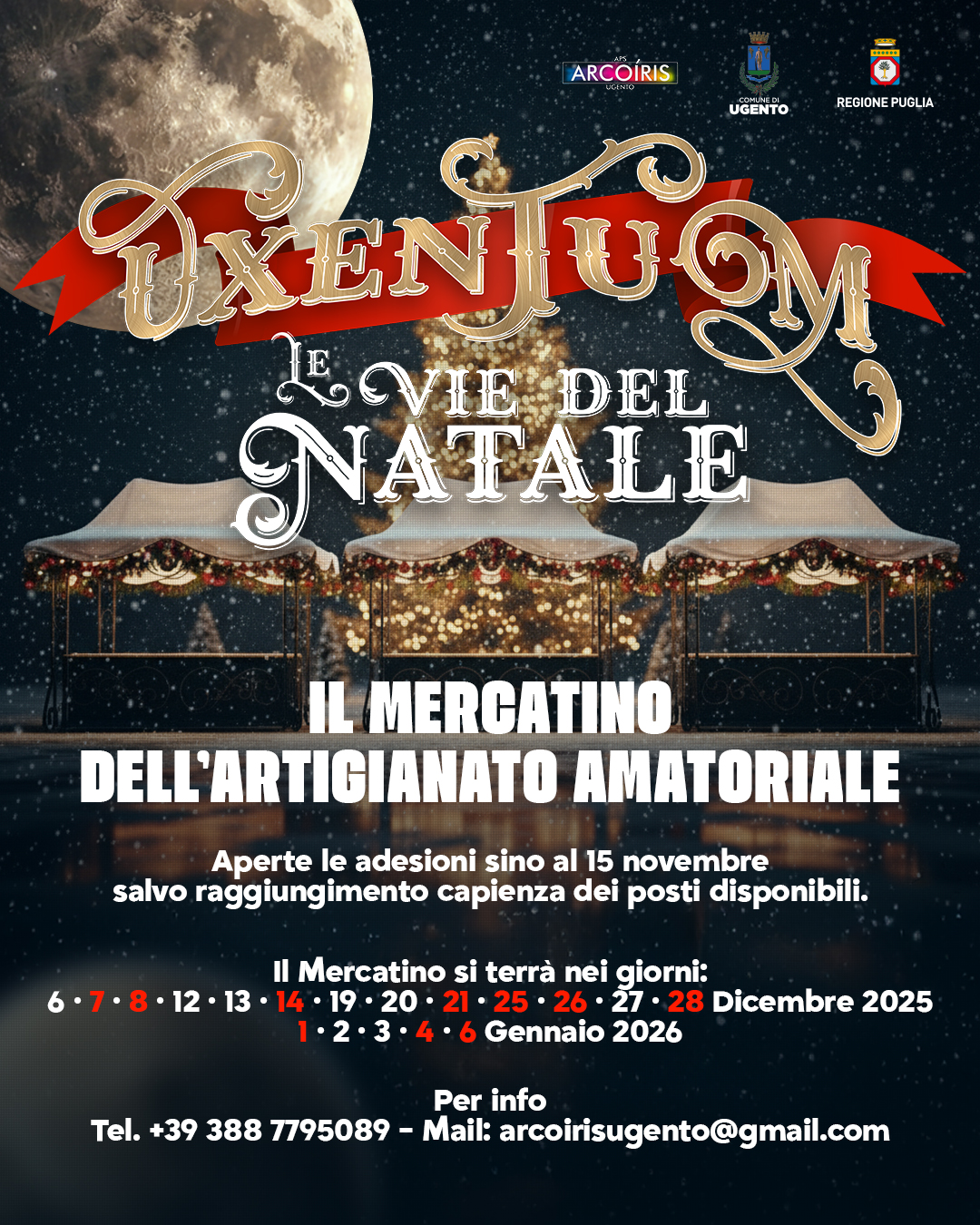 Siamo lieti di annunciare la 3ª Edizione di UXENTUM – Le Vie del Natale, l’evento che trasforma il nostro incantevole Centro Storico in un vero e proprio villaggio natalizio!